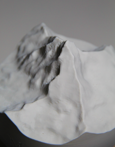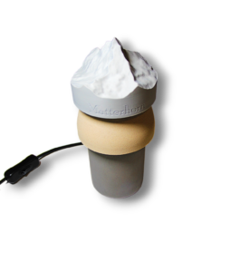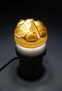 Lampka z podstawą betonową i kloszem w kształcie szczytu Matterhorn osadzonym na drewnianym wsporniku. Klosz i wspornik są elementami wydrukowanymi na drukarce 3D.