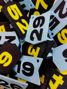 Wytrzymałe plakietki z wyceną trudności drogi/boulderu w skali 1-9.